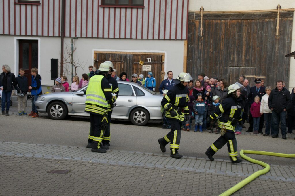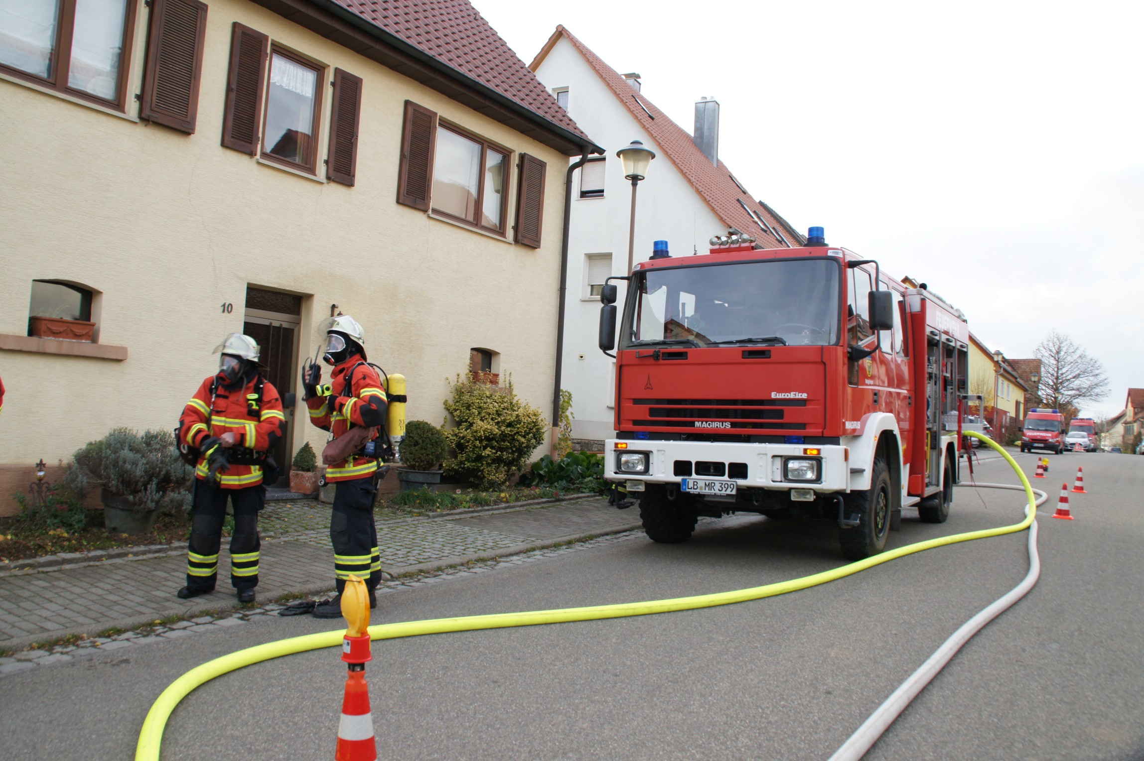 Bereits wenige Minuten nach der Alarmierung trifft das vollbesetzte Feuerwehrauto an der Einsatzstelle ein. Der Gruppenführer erkundet die Lage. Routiniert rüsten sich die Kameraden der Wehr mit Atemschutzgeräten aus, um im inneren des Gebäudes nach den vermissten Personen zu suchen. Während dessen bauen die Anderen eine Wasserversorgung vom Hydrant bis zum Strahlrohr auf. Kurze Zeit später trifft die zweite Gruppe der Wehr ein. Schnell lässt sich erkennen, dass das Feuer allein nicht unter Kontrolle gebracht werden kann. Während die erste vermisste Personen gerettet werden kann, treffen die Kameraden der Feuerwehr Unterriexingen ein.