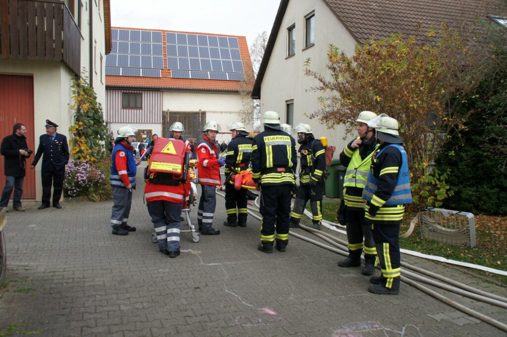 Im Heizraum eines Wohnhauses mit angrenzender Scheune ist ein Brand ausgebrochen. Zwei Menschen werden vermisst und das Feuer droht auf benachbarte Gebäude überzugreifen. Das Übungszenario für die diesjährige Hauptübung fordert von den Kameraden der Freiwilligen Feuerwehr vollen Einsatz.