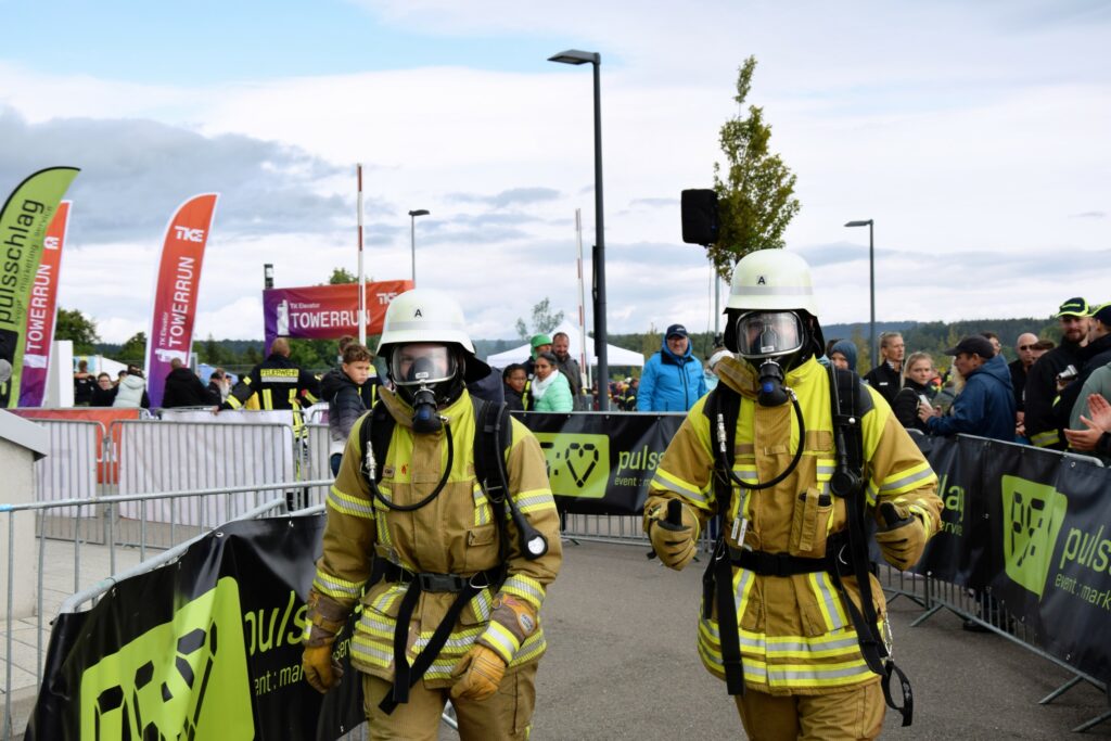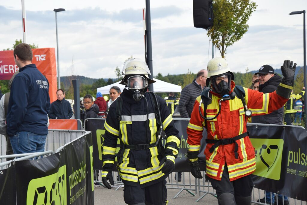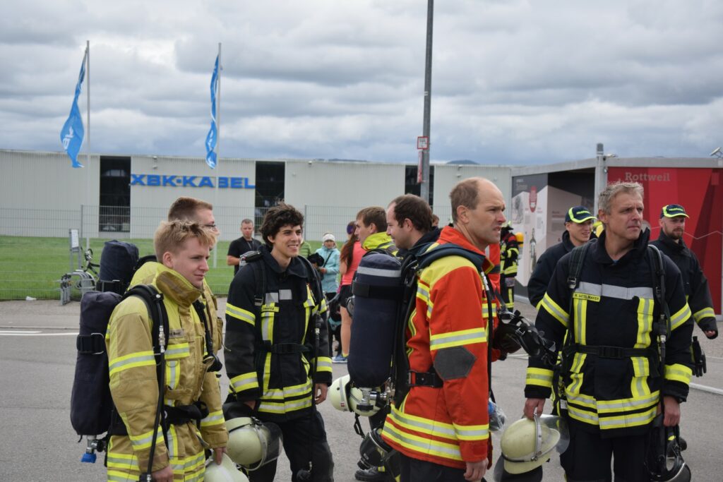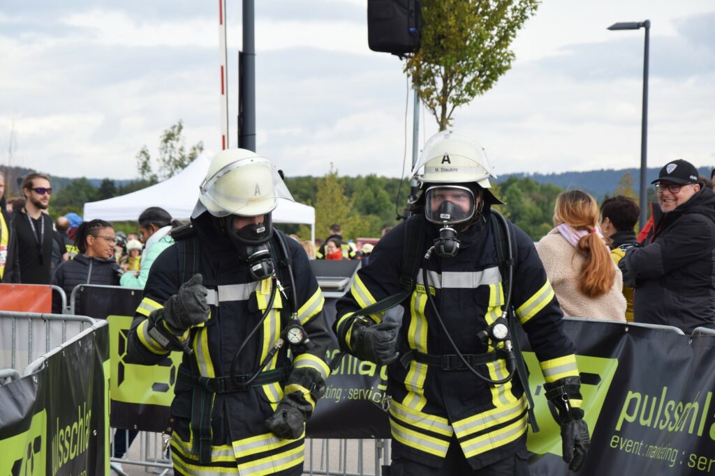 Trotz des nicht ganz optimalen Wetters ist die Stimmung sehr gut – man freut sich, sich mal wieder zu sehen und ist gespannt auf den in Kürze startenden Lauf. Denn etwas Anspannung gehört hier dazu: da unsere Teams mit angeschlossenem Atemschutzgerät laufen,