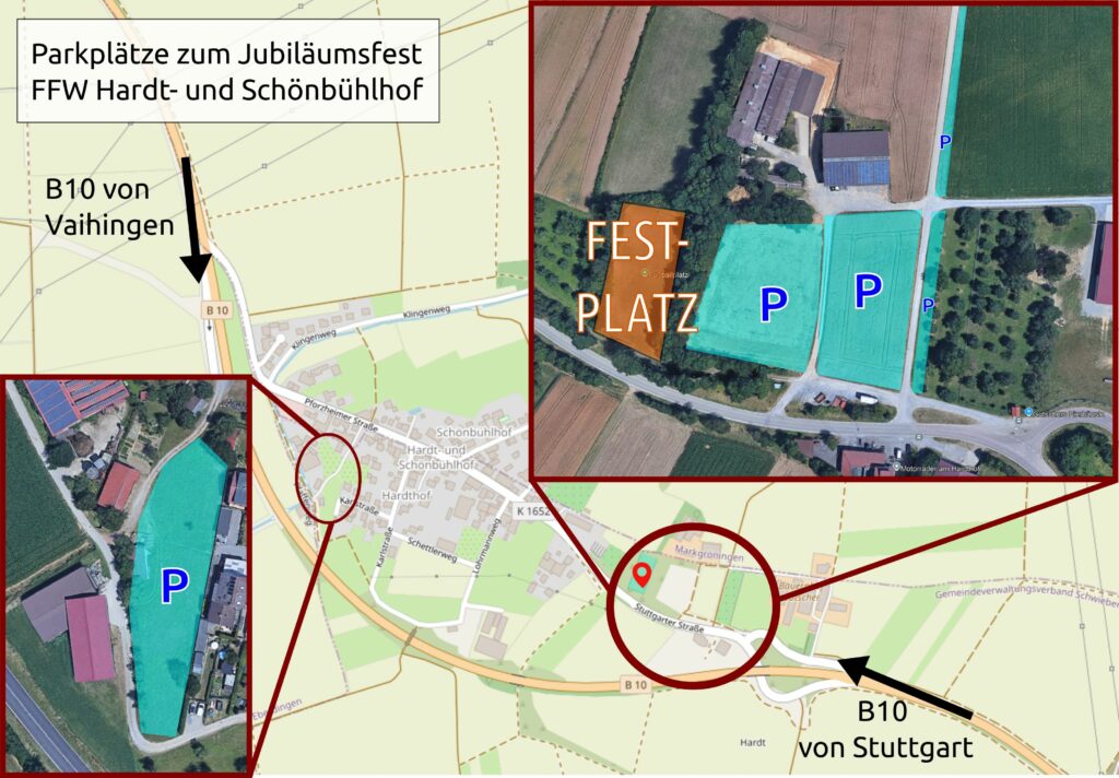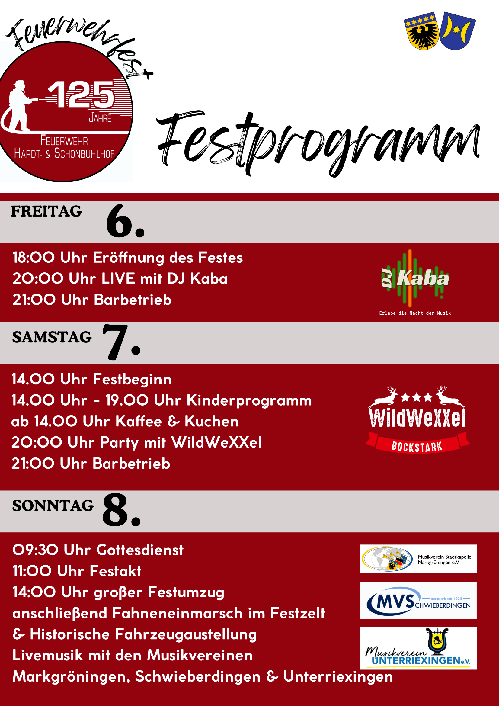 125 Jahre Freiwillige Feuerwehr Hardt- und SchönbühlhofVom 06. – 08. September 2024 feierte die Feuerwehr ihr Jubiläum mit einem großen Fest. Zum FestberichtDie Aufräumarbeiten sind mittlerweile abgeschlossen..Parkmöglichkeiten