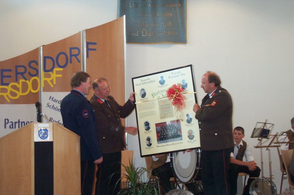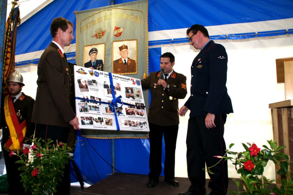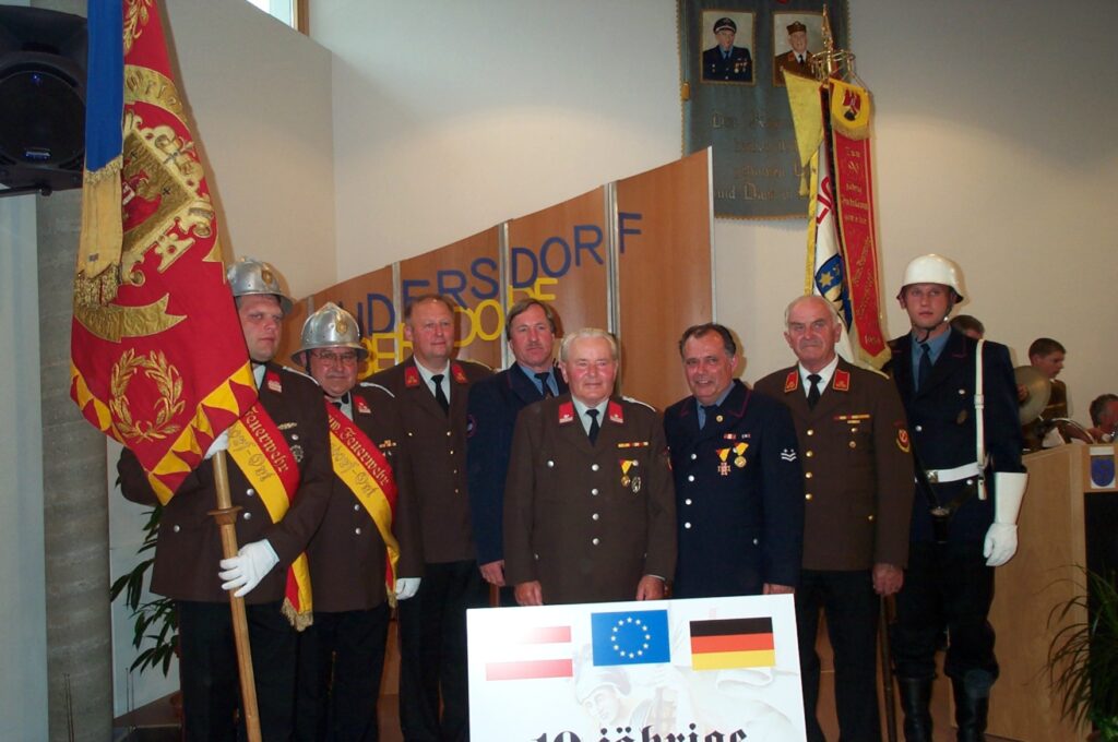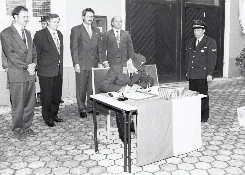 Unser ehemaliger Feuerwehrkamerad Adolf Burghardt war 1968 gemeinsam mit seinen Eltern in die Nähe ihrer ehemaligen Heimat ins südliche Burgenland gezogen und auch dort der Feuerwehr beigetreten. Der Kontakt zu alten Freunden jenseits der Grenzen wurde aufrechterhalten. Über die Jahre gab es gegenseitige Besuche und es entwickelten sich weitere Freundschaften, eine kameradschaftliche Beziehung zwischen unseren beiden Feuerwehren entstand.