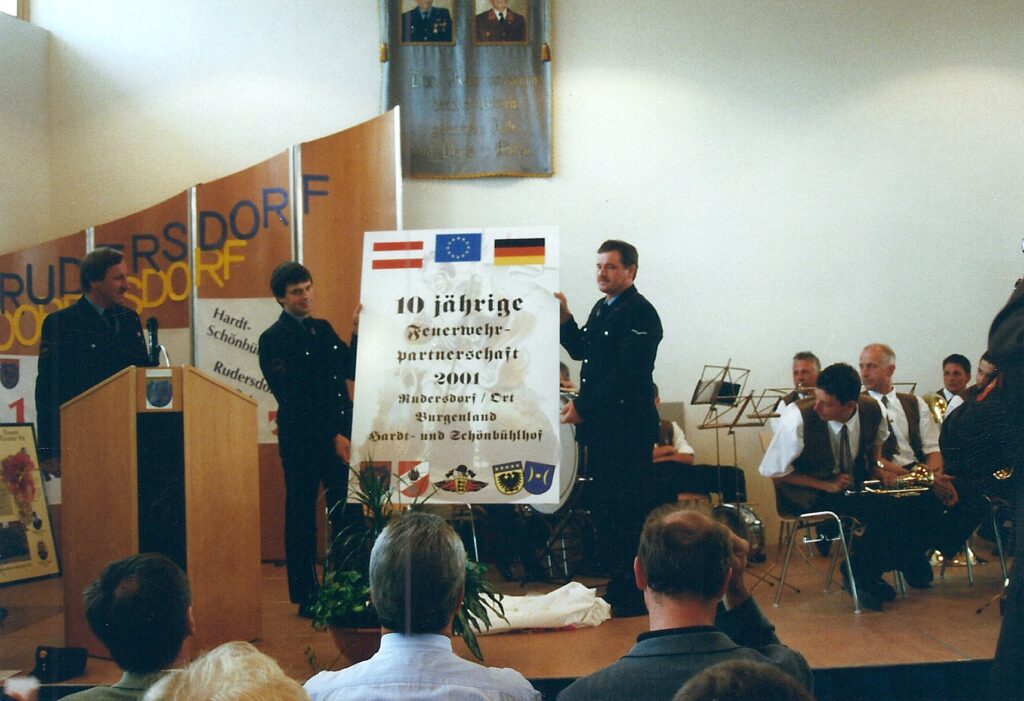 Im Jahre 2001 wurde das 10-jährige Bestehen der Partnerschaft in Rudersdorf gebührend gefeiert. Eingeladen war nicht nur die Freiwillige Feuerwehr Hardt- und Schönbühlhof, sondern auch die Bürgermeister von Markgröningen und Schwieberdingen, welche der Einladung gerne folgten.